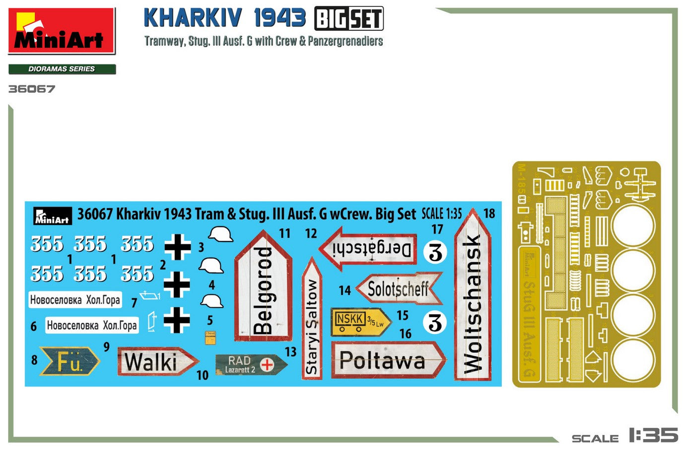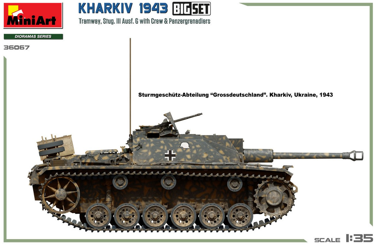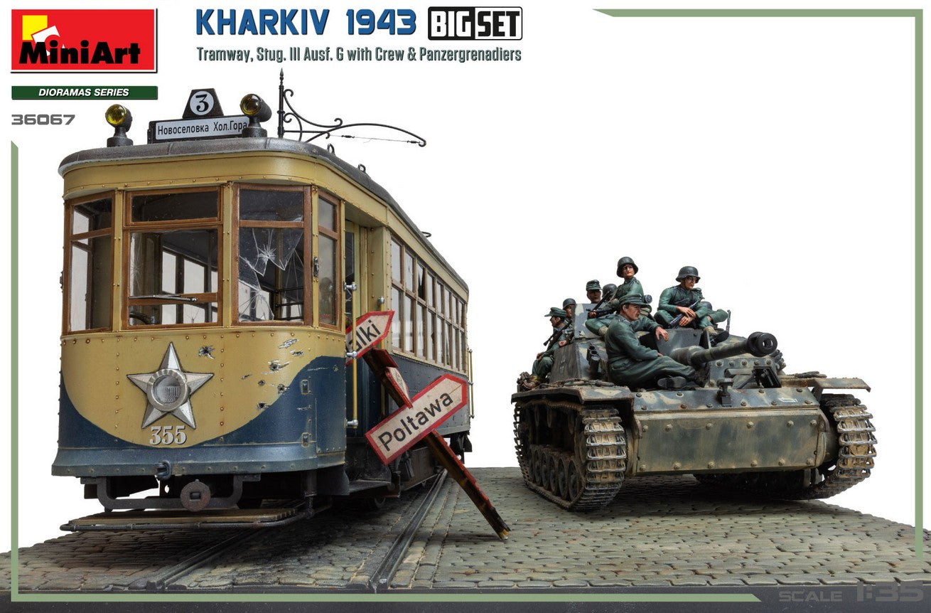 - Conjunto de carro de cañón de asalto alemán Stug III en su versión G y diorama con trabvía soviético durante la Batalla de Kharkov en 1943, en escala 1/35.