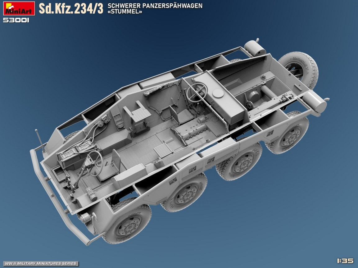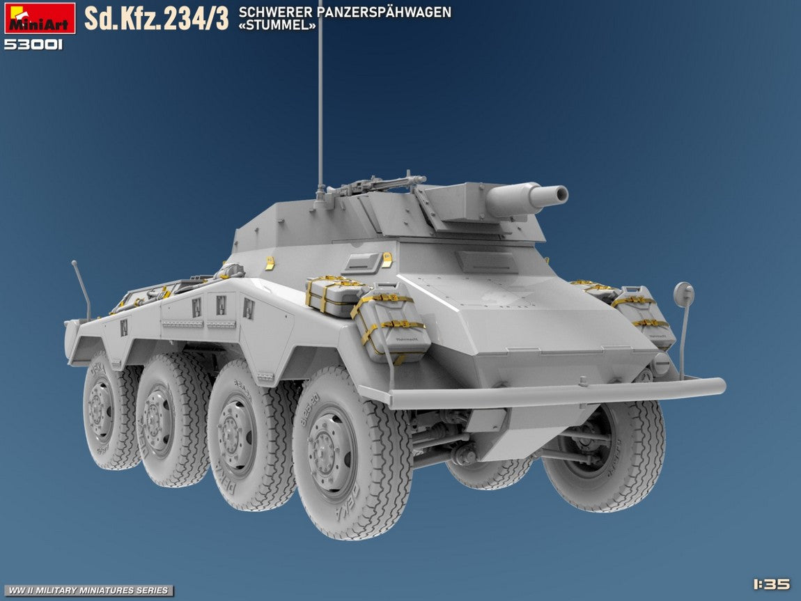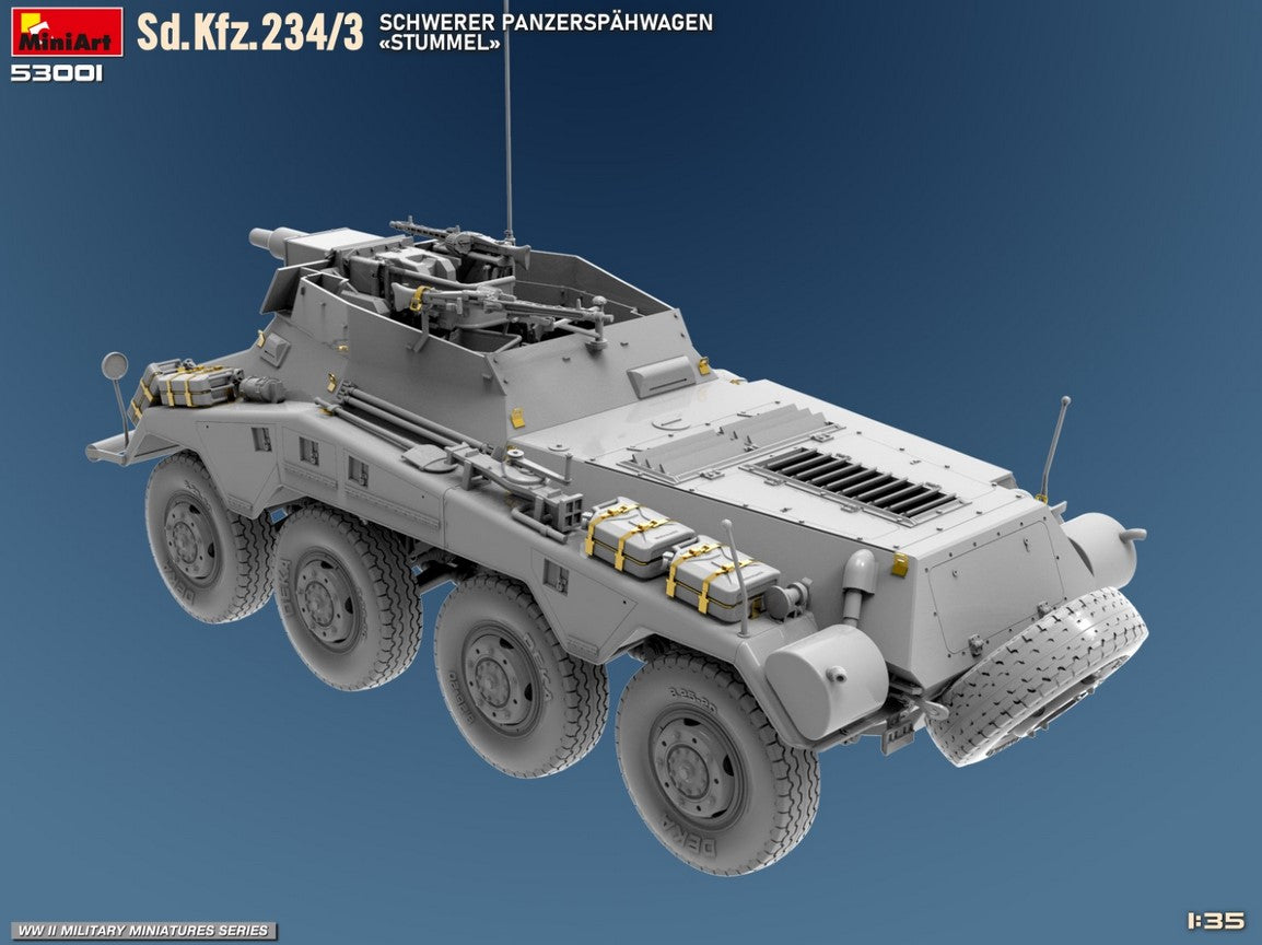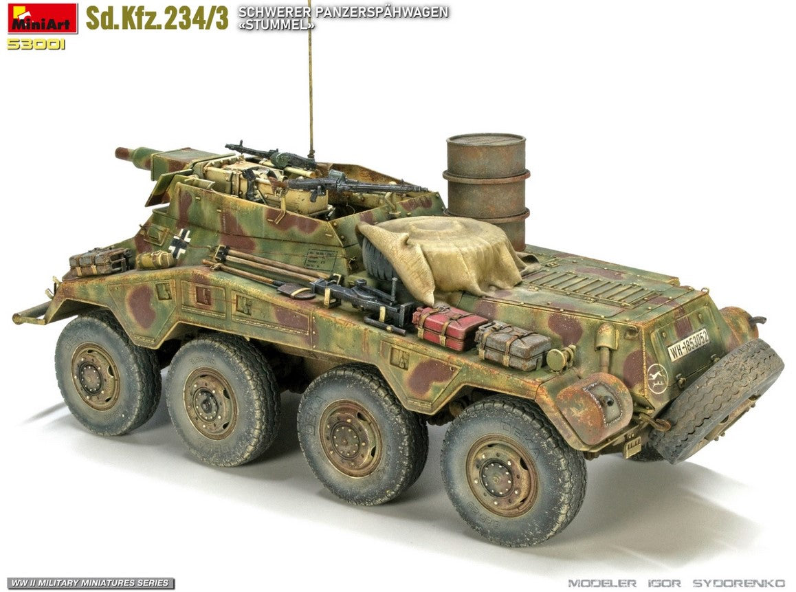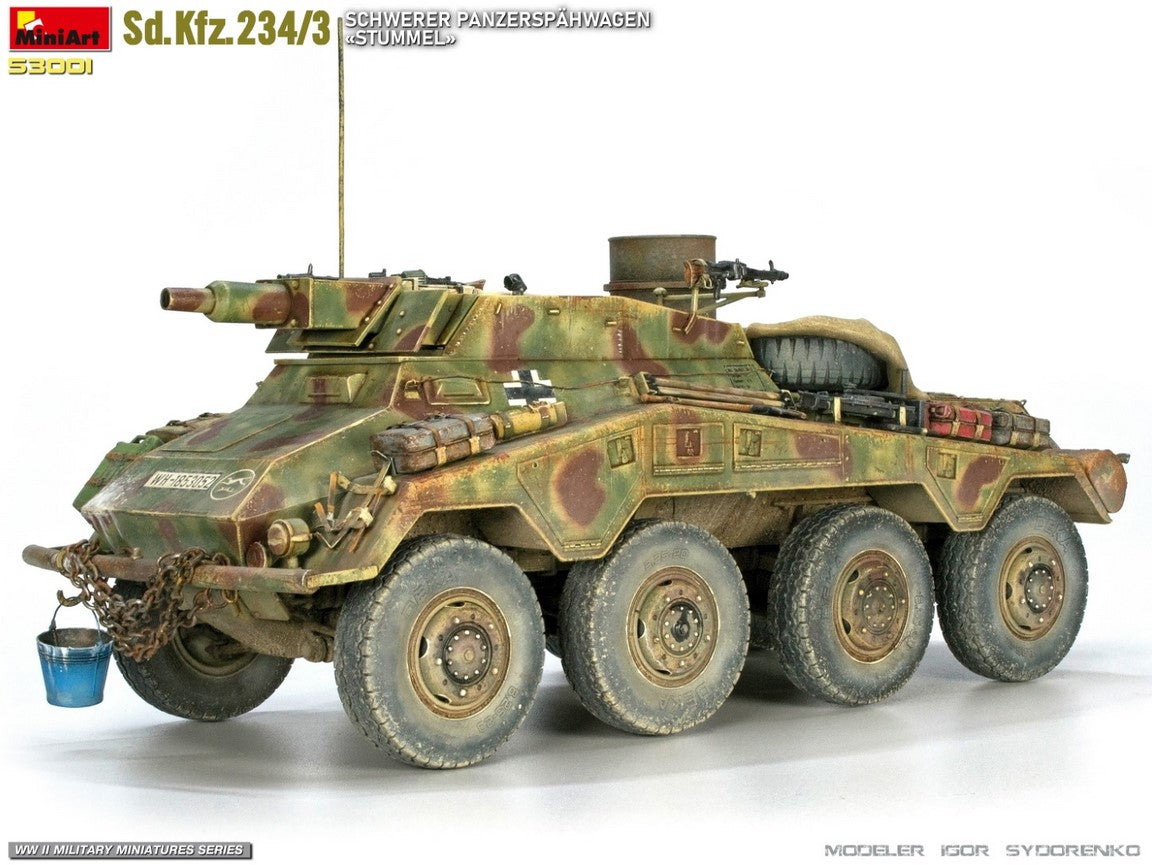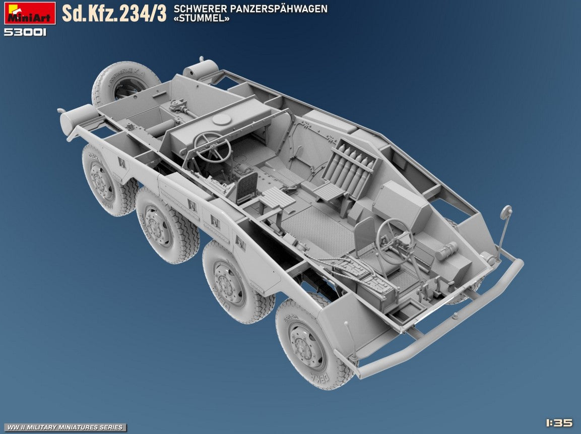 - Modelo de vehículo ligero Sd.Kfz. 234/3 Stummelcon cañón anti-carro corto de 75mm y con el interior completamente detallado, en escala 1/35.