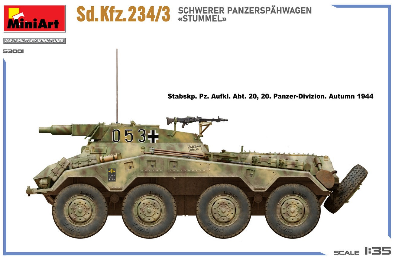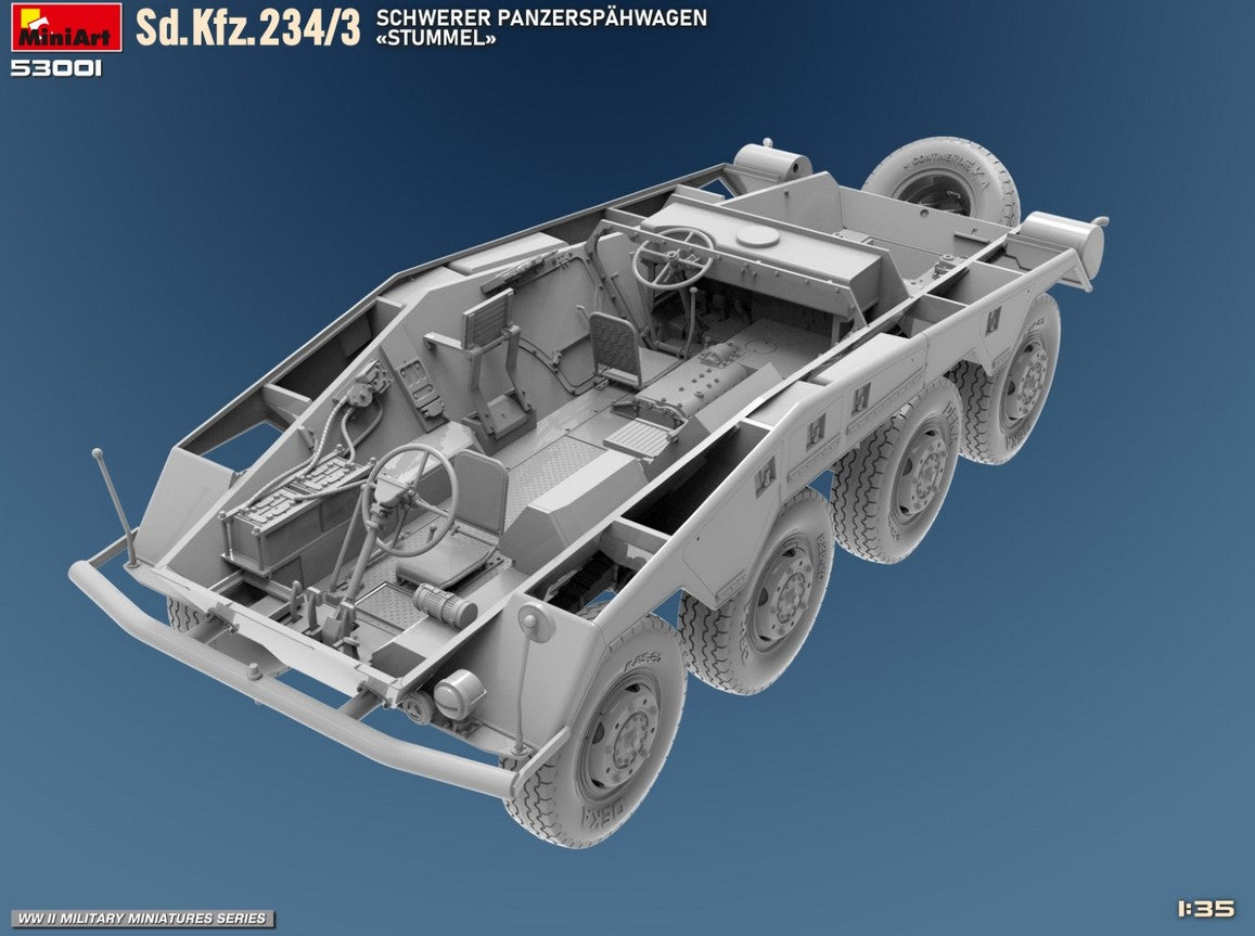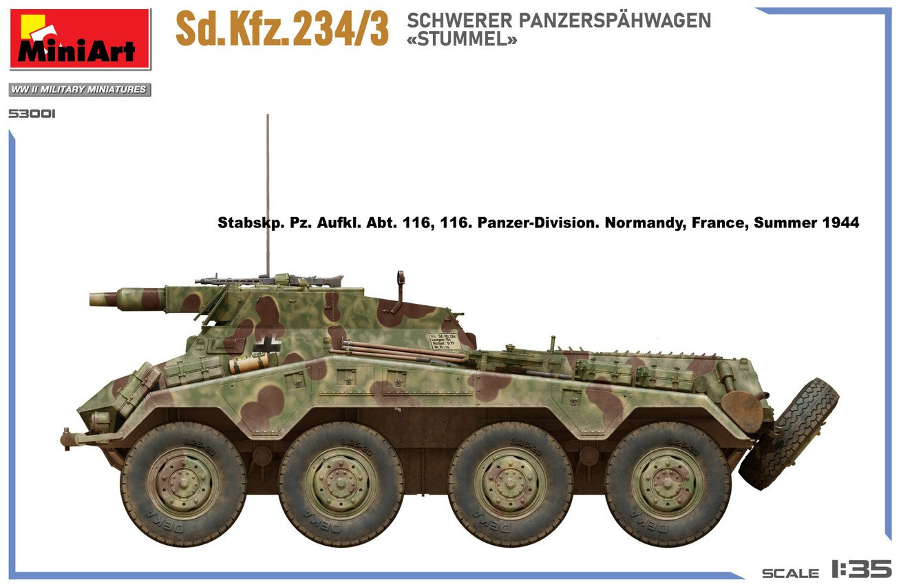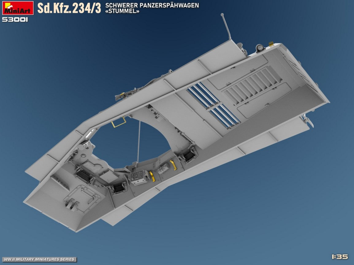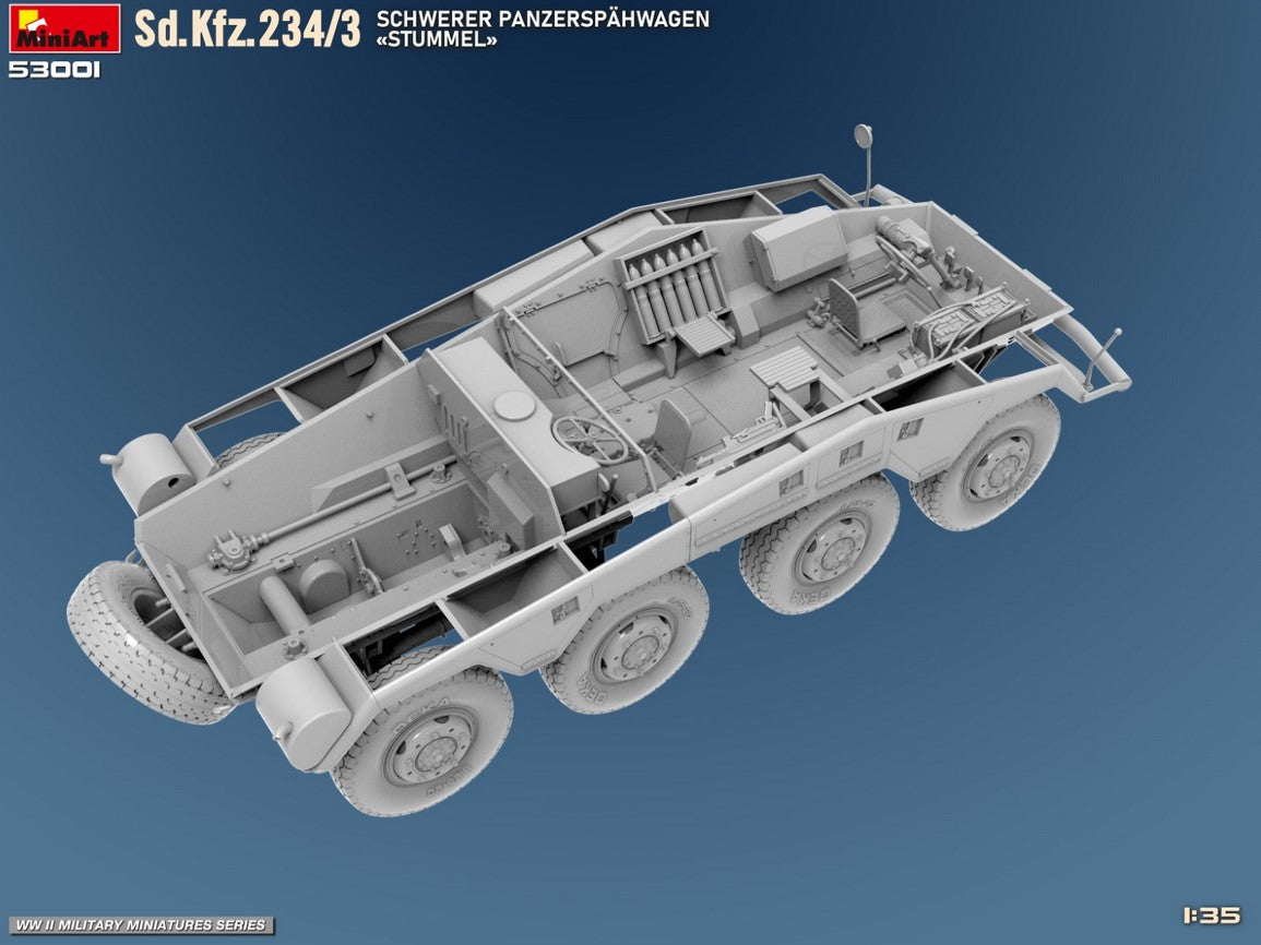 - Modelo de vehículo ligero Sd.Kfz. 234/3 Stummelcon cañón anti-carro corto de 75mm y con el interior completamente detallado, en escala 1/35.