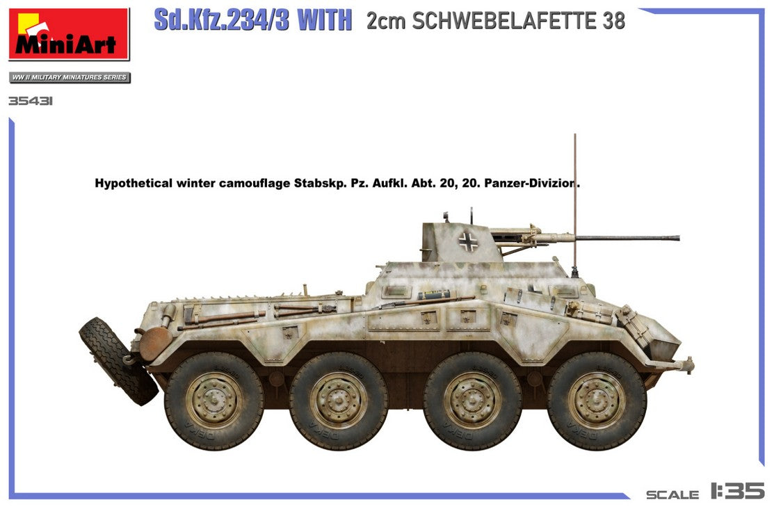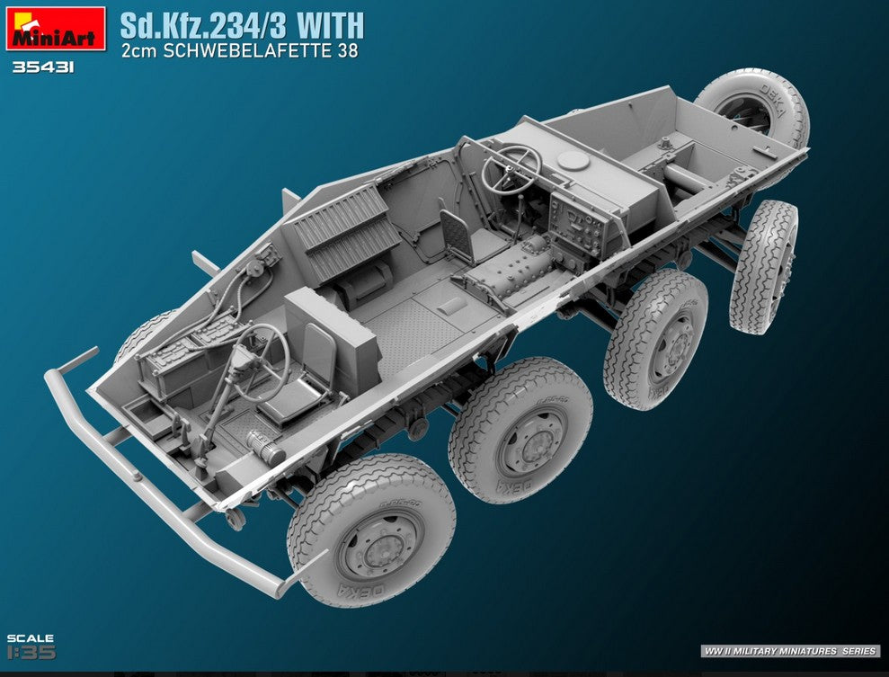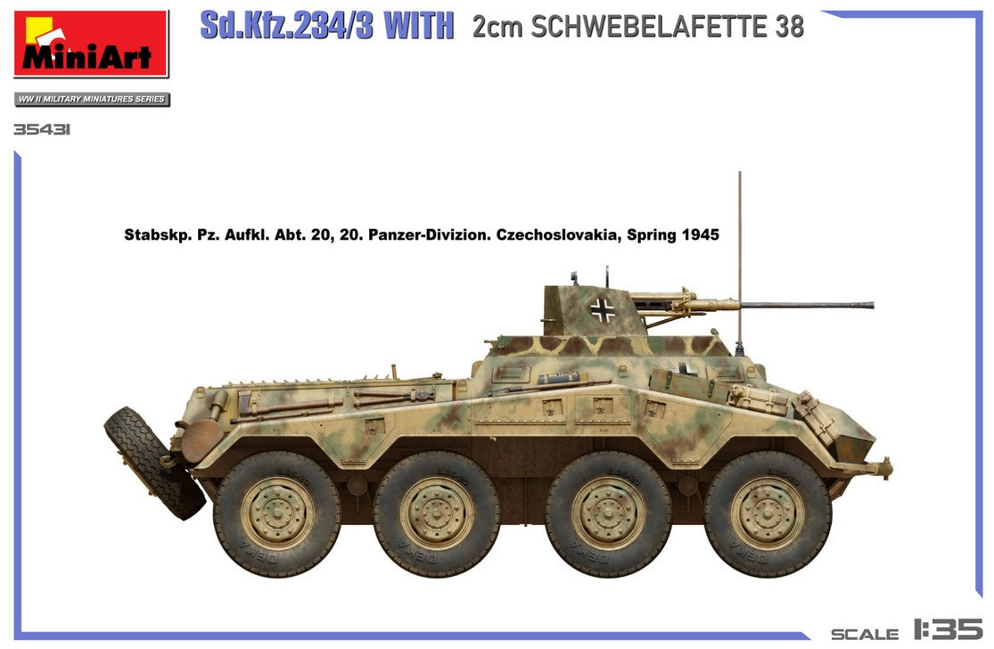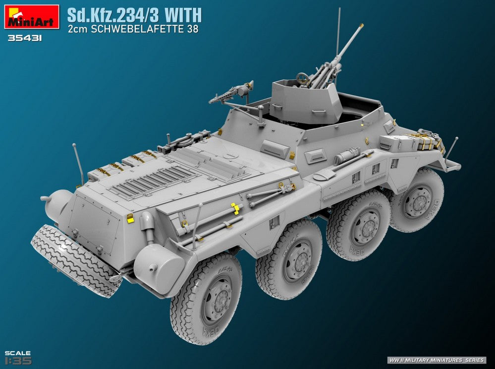 - Modelo de vehículo ligero Sd.Kfz. 234/3 con cañón antiaéreo Flak38 de 20 mm, en escala 1/35.