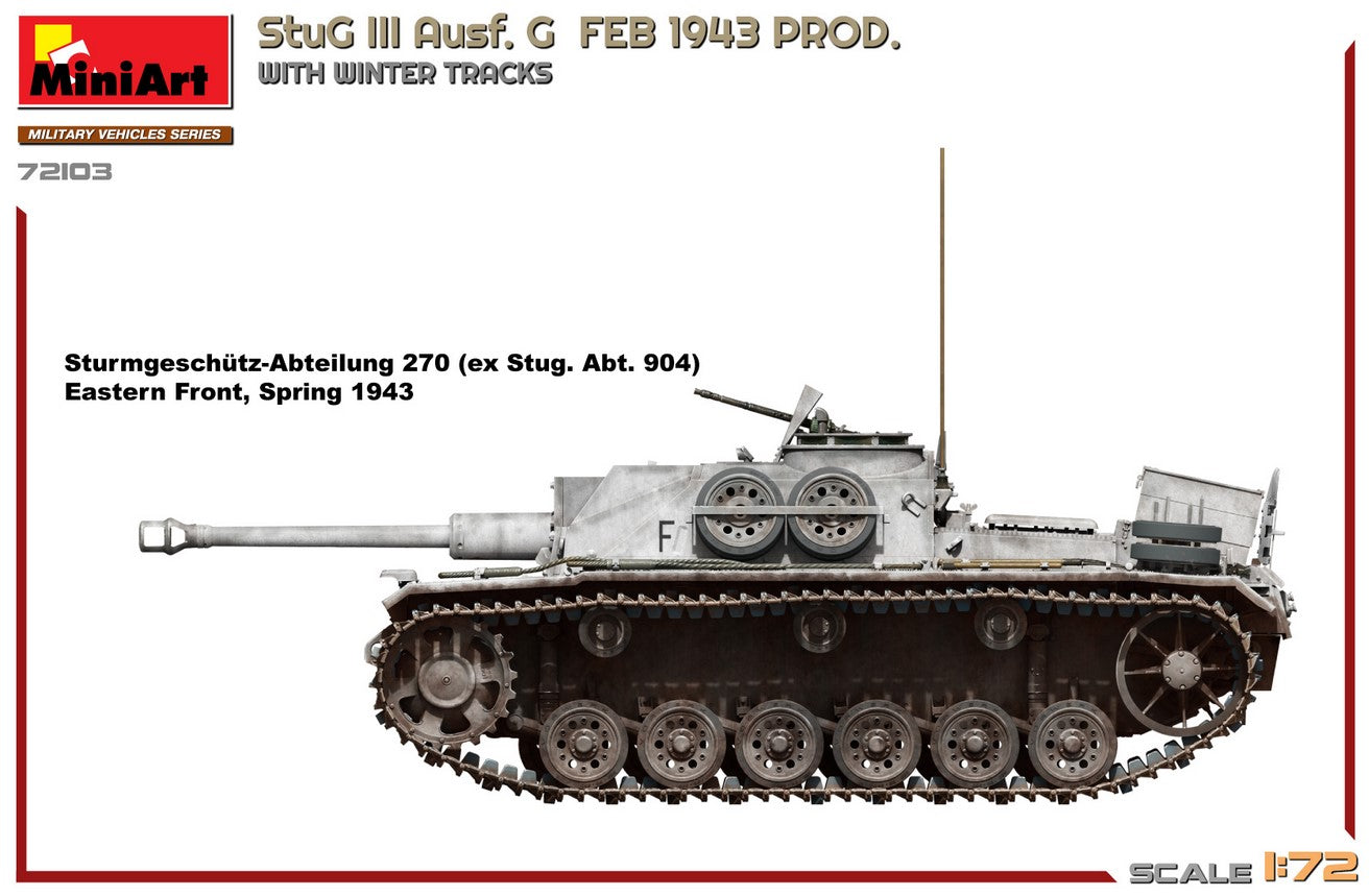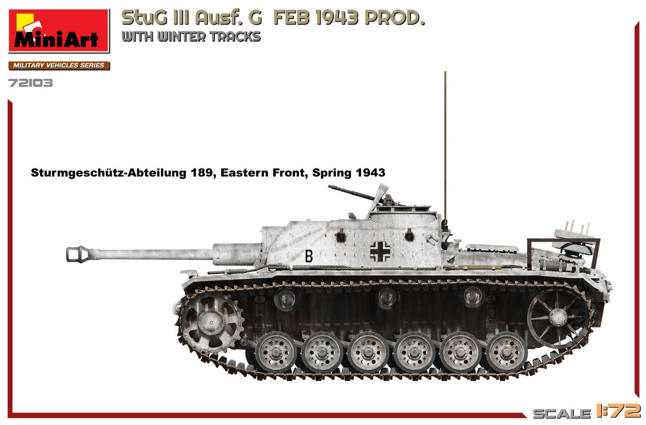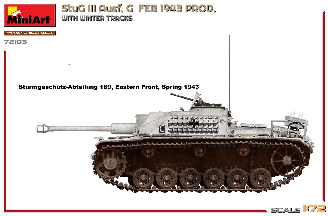 - Modelo de cañón de asalto alemán Stug III en su versión G, de producción en febrero de 1943 con cadenas de invierno, en escala 1/72.