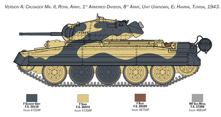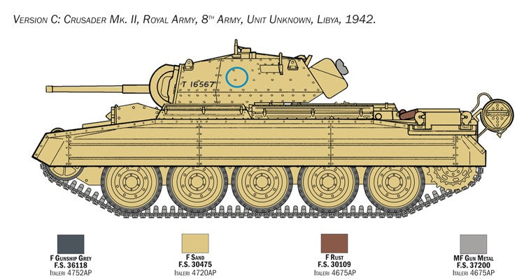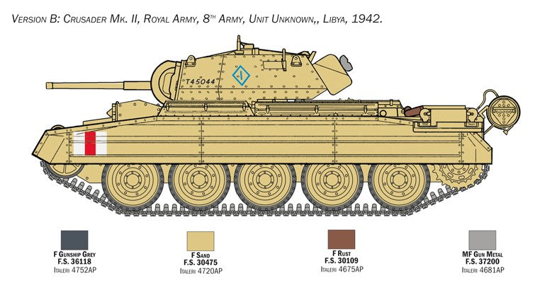 - Maqueta de carro británico Crusader en su versión Mk.II ambientado en la campaña de África del 8º Ejército Británico, a escala 1/35.