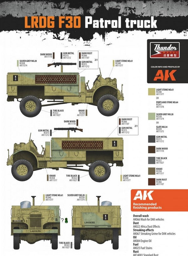 - Modelo de vehículo de transporte ligero de personal británico Patrol Truck F30 que utilizaban las fuerzas británicas del Long Range Distance Group (LRDG) en la campaña del Norte de África, en escala 1/35.