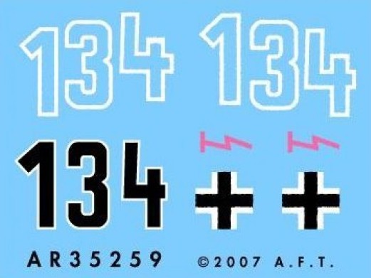 - Hoja de calcas con las insignias, numerales y códigos que portaba el Tiger I del oficial Will Fey de la 1ª Compañía del Batallón de carros pesados 102 de las SS, durante la Batalla de Normandía, en escala 1/35.
