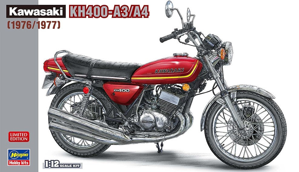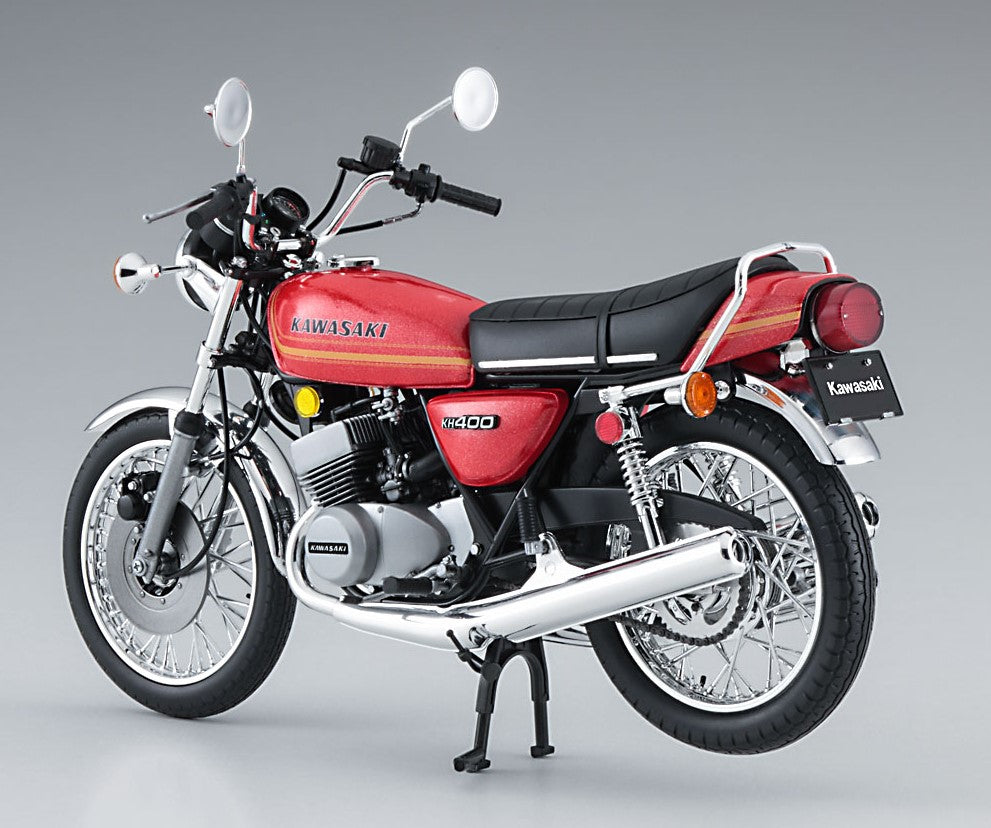 - Maqueta sin montar ni pintar, réplica de la Kawasaki KH400 en sus versiones A3 y A4 de los años 1976 y 1077, en escala 1/12.