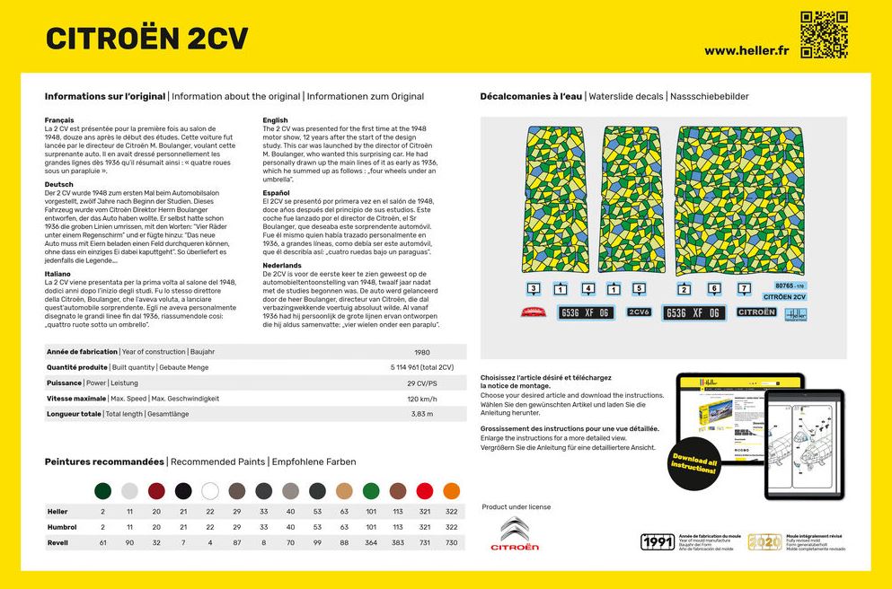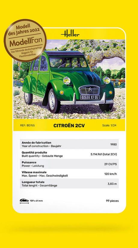 - Maqueta sin montar ni pintar del clásico coche utilitario Citroen 2 CV, conocido como el dos caballos, en escala 1/24.