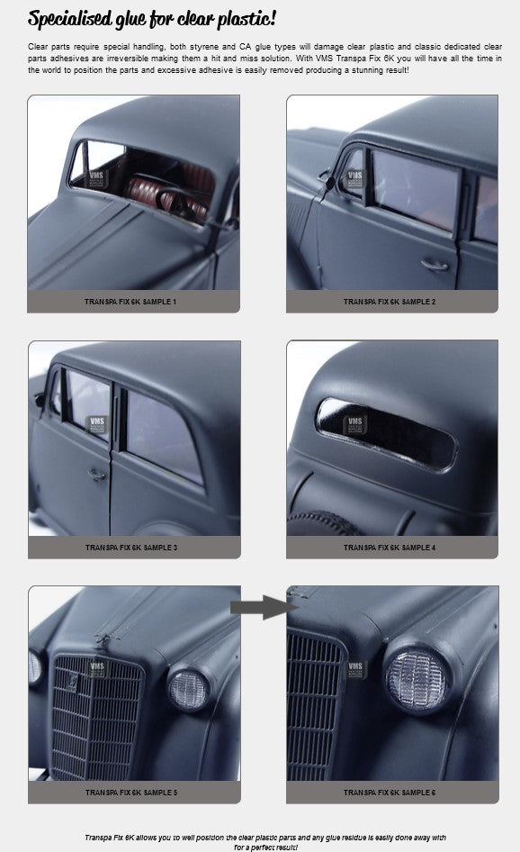 - Con VMS Transpa Fix 6K tendrá todo el tiempo del mundo para colocar las piezas y el exceso de adhesivo se eliminará fácilmente produciendo un resultado sorprendente.