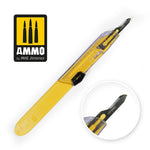 - Además, dispone de una tapa integrada en el mango que protege de posibles cortes y de una regla de 5 cm en uno de sus laterales.