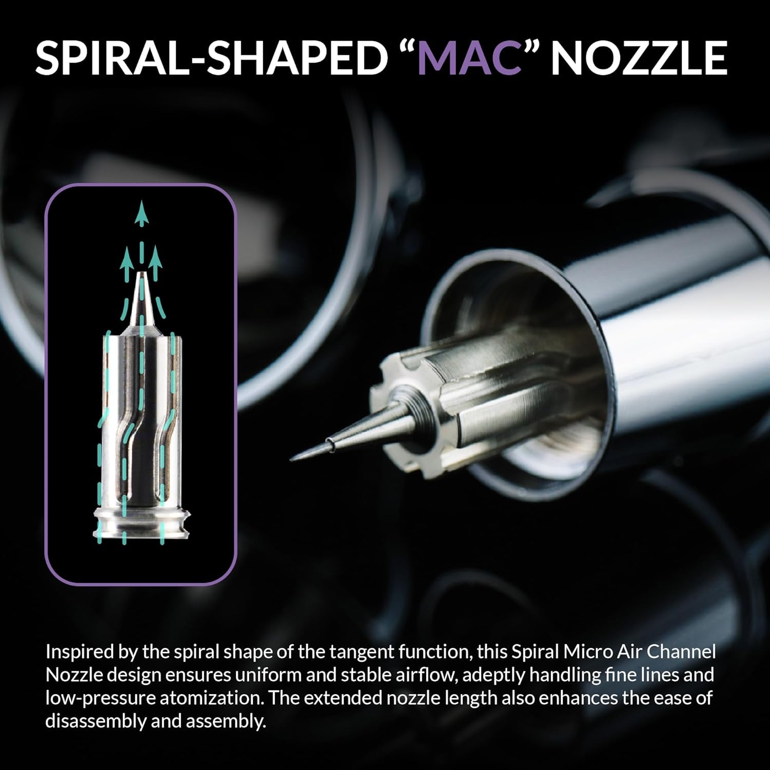 - Boquilla "MAC" en forma de espiral: inspirada en la forma espiral de la función tangente, este diseño de boquilla de micro canal de aire en espiral garantiza un flujo de aire uniforme y estable, manejando correctamente líneas finas y atomización de baja presión. La longitud extendida de la boquilla también mejora la facilidad de desmontaje y montaje.