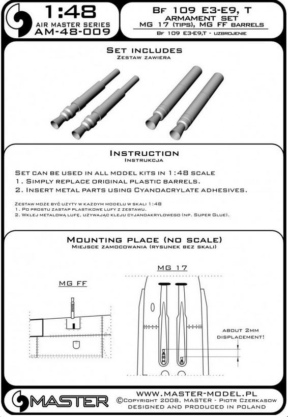 - Juego de 4 piezas de ametralladora MG 17 para morro y MG FF para alas de avión BF 109 E3, en escala 1/48.