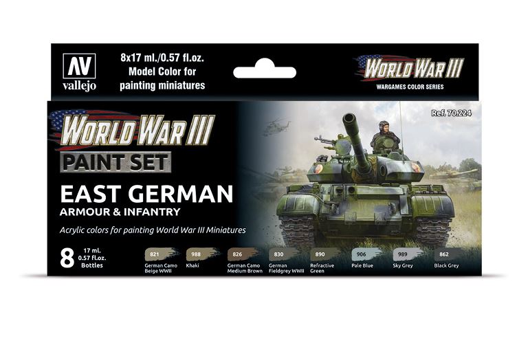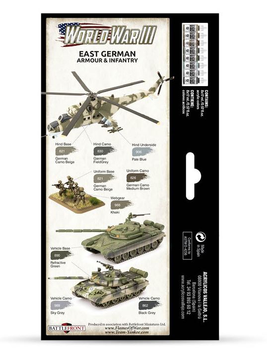 Este estuche, en combinación con el Utility Paint Set, contiene los colores necesarios para pintar el ejército de Alemania del Este de la Tercera Guerra Mundial; permitiendo pintar tanques T-72, helicópteros Lynx e infantería con los colores adecuados.